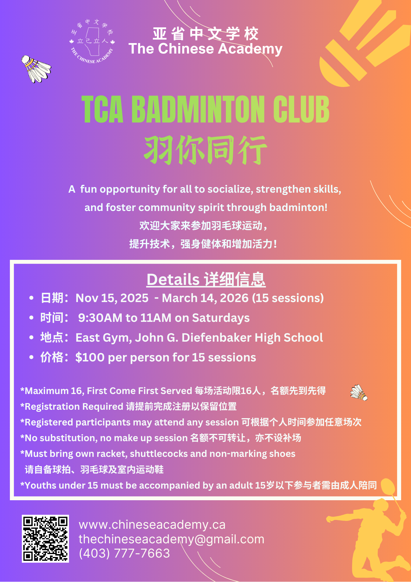 To register, please visit: https://chineseacademy.ca/product/2025-2026-badminton-club/